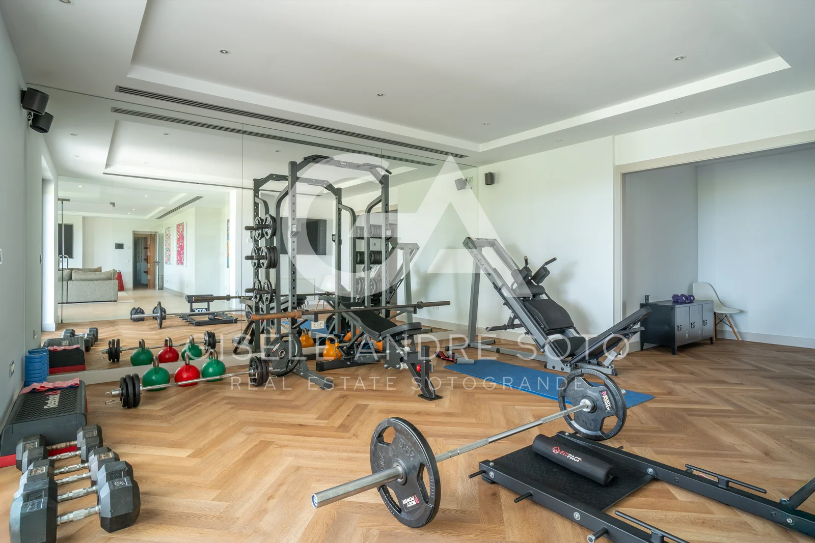The garden-level lower floor offers a versatile family entertainment room, a fully equipped gym, a rejuvenating sauna, and an additional en-suite guest bedroom, all opening onto expansive terraces and the lush garden, creating a seamless connection with the outdoors.